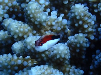 サンゴの上にちょこんとホシゴンべ幼魚。成魚のテンテン模様は眉間に集中!