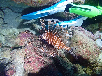 ゲストさまの足になぜかついてくるハナミノカサゴちゃん。逃げて~( ゚Д゚)
